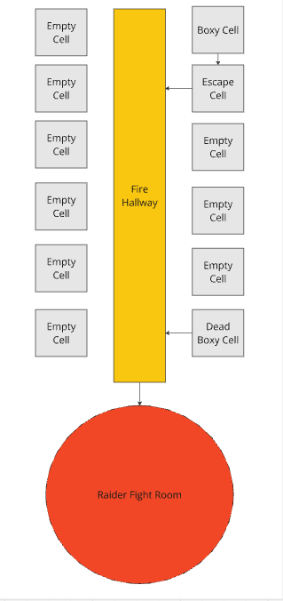 For the first section I wanted to tutorialise the platforming and movement while creating a safe space for players to learn. I settled on a linear hallway where the escapee must escape from their cell and and jump down a burning hallway.
