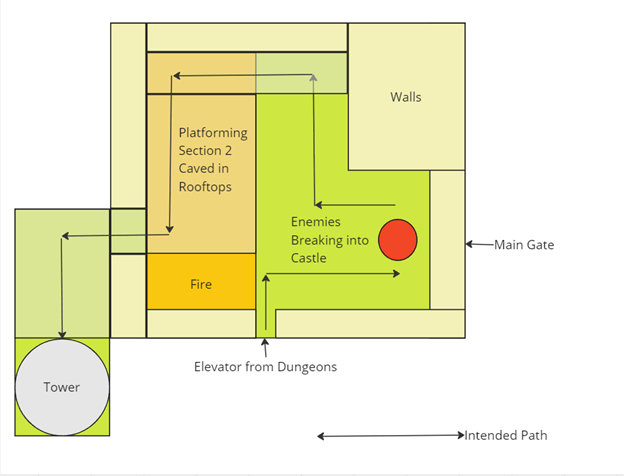 After some playtesting, I changed some combat and fixed a bug where the corpse asset was sliding around like a hockey puck. I then moved onto the final two areas, with a couple new diagrams to ideate, I decided that the second section would involve jumping across a roof top over a massive fire to reach the base of the tower.