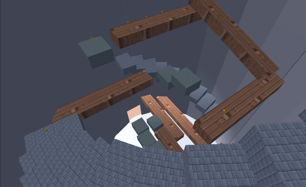 I final section is a vertical platforming area where instead of death the player is punished for failure by having to fall back down to the bottom. This was inspired by games like Getting Over It and Pogostuck.