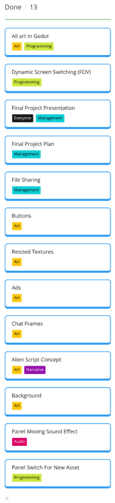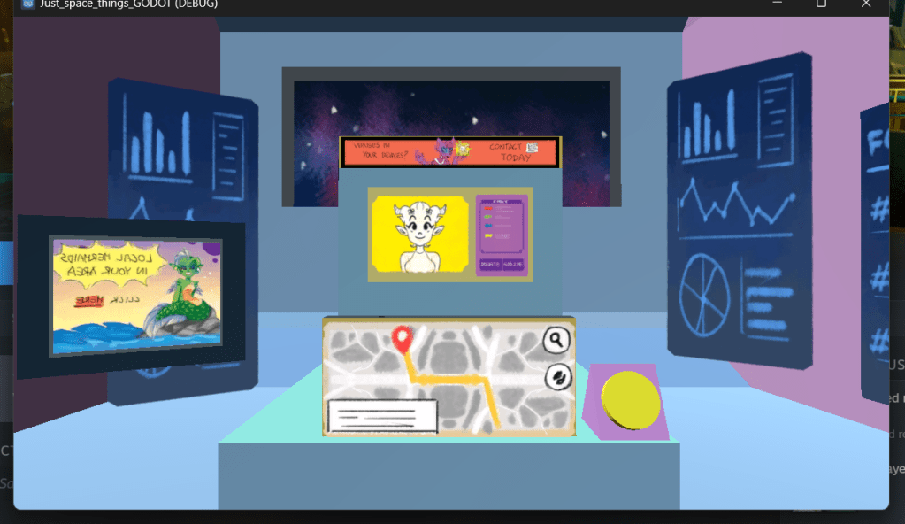 After a week or two of ideation and iteration we settled on a final concept. We decided to make it in Godot and the game would take place on just 4 or 5 screens which would be moved between with the arrow keys. each screen would give the player some kind of information. The player needs to travel in their spaceship to create social media content and generate engagement so that the ship stays powered. They need to keep up with trends while managing their time so that the trends don’t change too quickly.